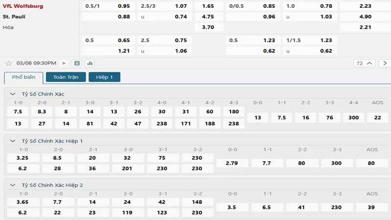 De bet dự đoán tỉ số trận đấu Wolfsburg vs Pauli
